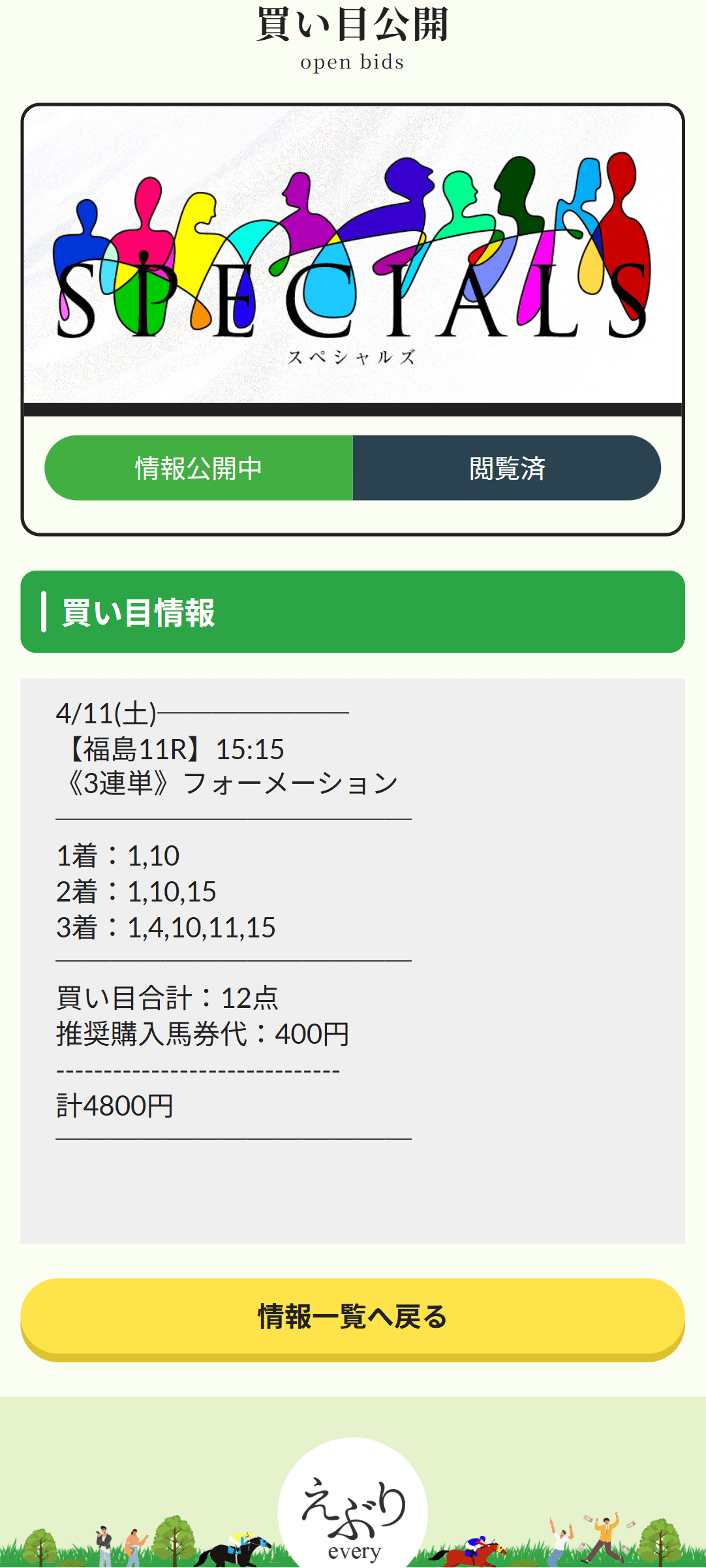 土曜の福島って、ちょっと気を抜くと人気と名前だけで買ってしまうんですけど、えぶりのスペシャルズはそこが違いました。4月11日福島11R・吾妻小富士Sで決まったのは1→15→11。ラタフォレストは5人気でしたが、道中は⑤④④③で無理なく運んで上がり37.0、2着のタガノミストは前でしぶとく粘り、3着のスナークラファエロも好位から残していて、福島ダ1700らしい立ち回り勝負をそのまま買い目にしていた感じでした。3連単は98,200円。1点400円の指定だから、4,800円が392,800円。スペシャルズみたいに、先行勢の残し方と差し込む位置取りのバランスがいい情報は、見ていて安心感があります。