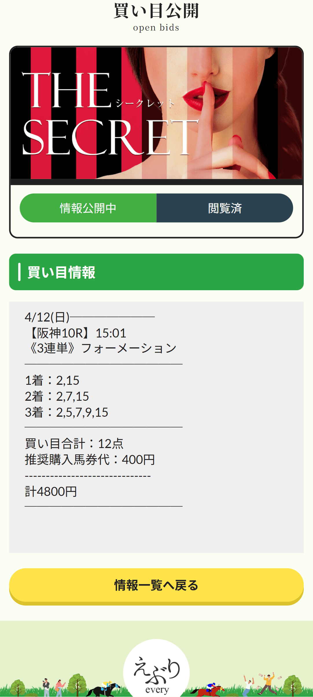 派手な超大穴を待つより、こういう「ちゃんと刺さる組み方」のほうが私は好きです。えぶりのTHE SECRETは、4月12日阪神10R・京橋Sで2→7→5を仕留めてくれました。1着のマイネルエニグマは6人気で、道中は⑦⑦⑦⑦から脚を温存して上がり33.9。2着ミュージシャンは前で運んでしぶとく、3着バッデレイトも好位からまとめていて、前を見ながら差せる馬をきれいに並べた印象です。3連単37,620円を1点400円で取れたので、4,800円が150,480円。爆発力だけじゃなくて、レースの流れに合わせた着地のうまさで信頼したくなる情報でした。