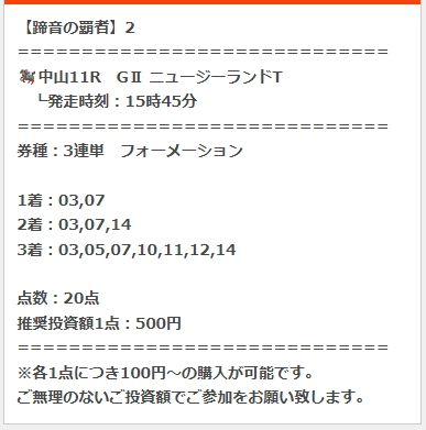 福島11Rの吾妻小富士ステークスで49万1000円、中山11Rのニュージーランドトロフィーで29万5700円。配当総額は78万6700円。