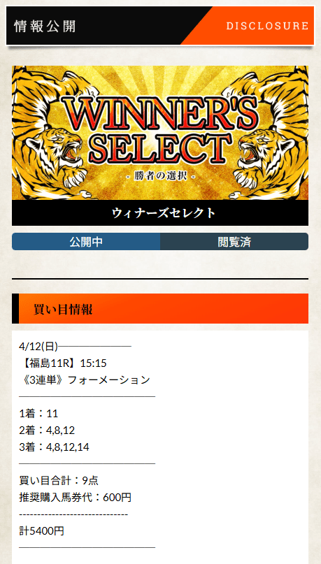 こういうのを見ると、やっぱりウィナーズセレクトは“勝ち馬をどこで決めるか”が上手いです。福島11Rで5番人気のサヴォーナを頭に置いて、2着は6番人気、3着には人気サイドを残しながら、三連単の配当は7万2050円。画像の600円で計算した配当総額は43万2300円でした。人気薄をただ振り回した感じじゃなくて、軸はちゃんと配当になるところに置いて、相手で崩しすぎない。このバランスがきれいなんですよね。競馬を長く見てると、こういう“無理してないのにしっかり高い”買い目がいちばん信用できます。